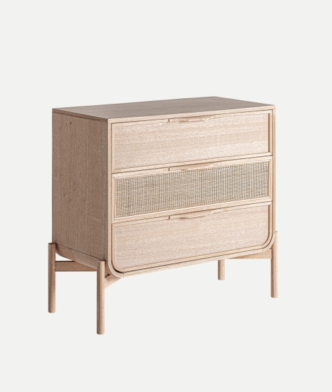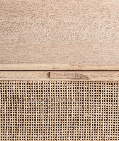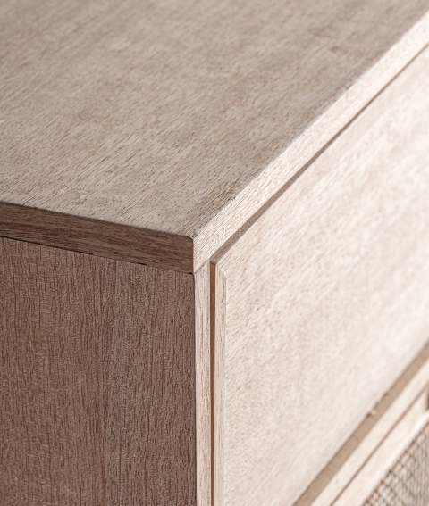 Cómoda rectangular weurtz, en color marrón claro, de estilo nórdico. Fabricado en madera de fresno, combinado con ratán.