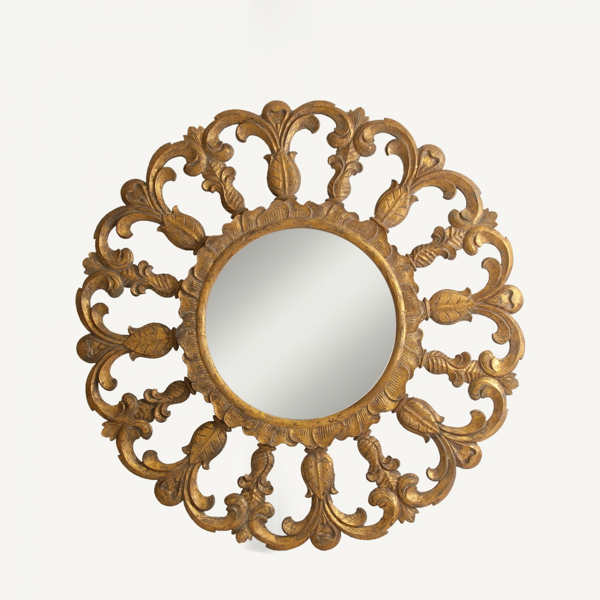 ESPEJO REDONDO, EN COLOR ORO VIEJO DE ESTILO ART DECO, FABRICADO EN MADERA TROPICAL COMBINADO CON ESPEJO