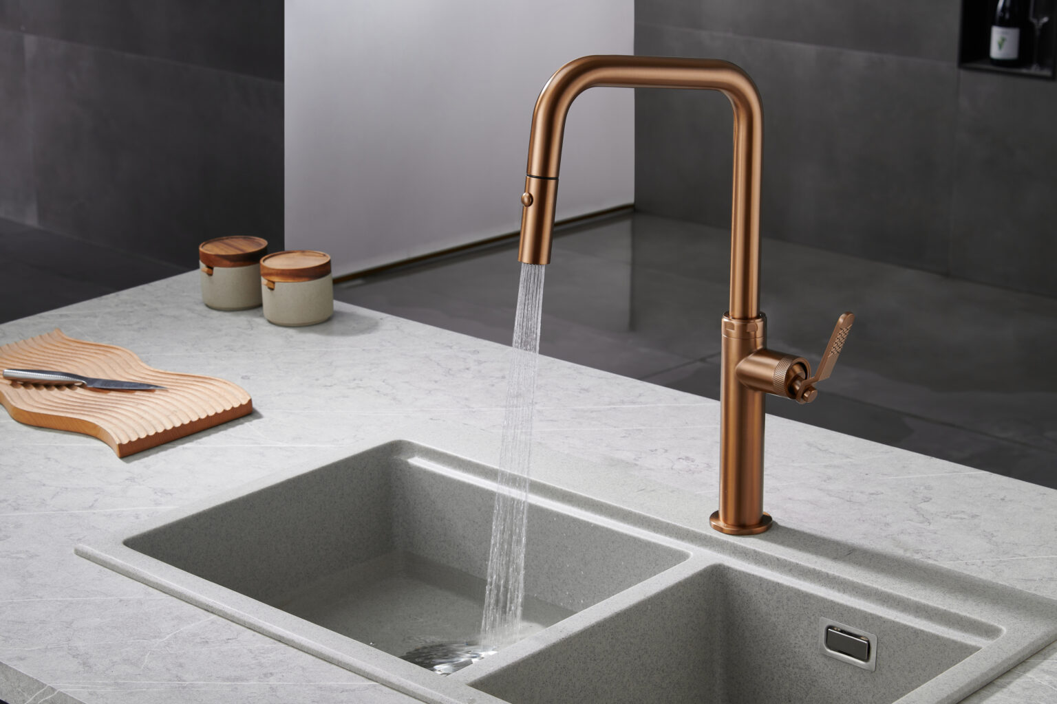 Grifería monomando. Caño extraíble. Difusor con dos funciones. Cuerpo de grifería de latón. Acabado oro rosa cepillado. Cartucho cerámico ø30mm. Latiguillos ø3/8″