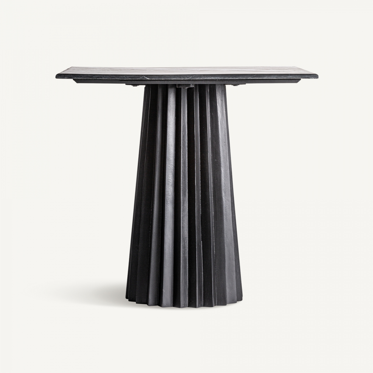 Mesa bar cuadrada plissé wood, en color negro, de estilo art deco. Fabricado en madera de mango, combinado con mármol mate. Producto desmontable.