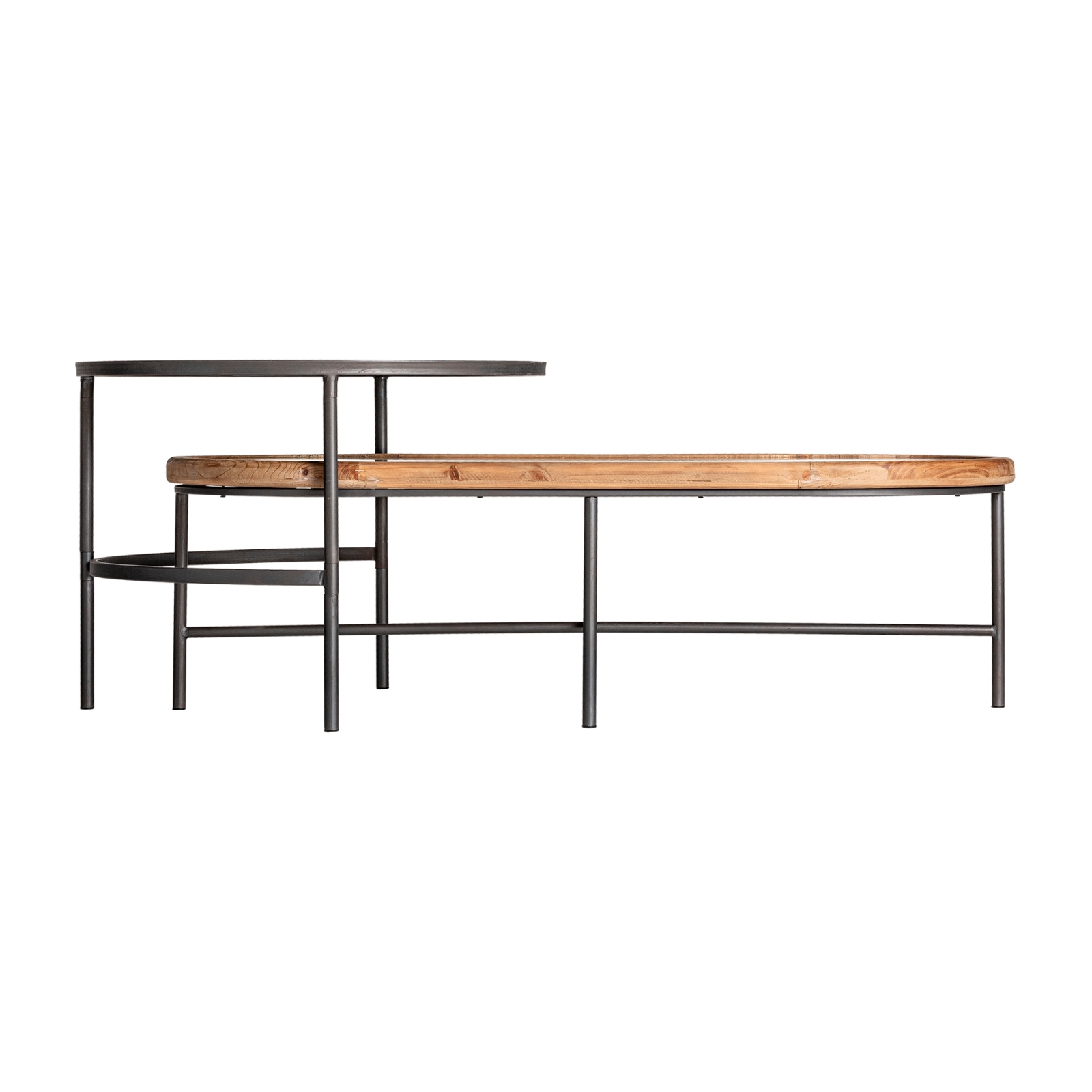 Juego de dos mesas de centro que combinan a la perfección en los ambientes más cálidos. Una de ellas, de forma alargada, combina el metal con la calidez de la madera de abeto. La otra, de forma circular, combina el metal con el vidrio templado en color negro. Dos piezas que se juntan para crear una combinación cálida y elegante. JUEGO 2